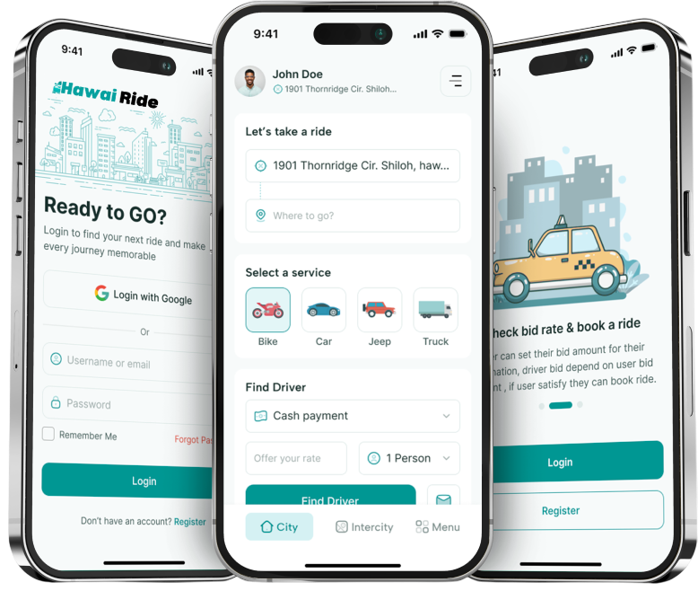 Riders enter their trip details, and drivers submit competitive bids. Riders can compare offers based on price and ratings.